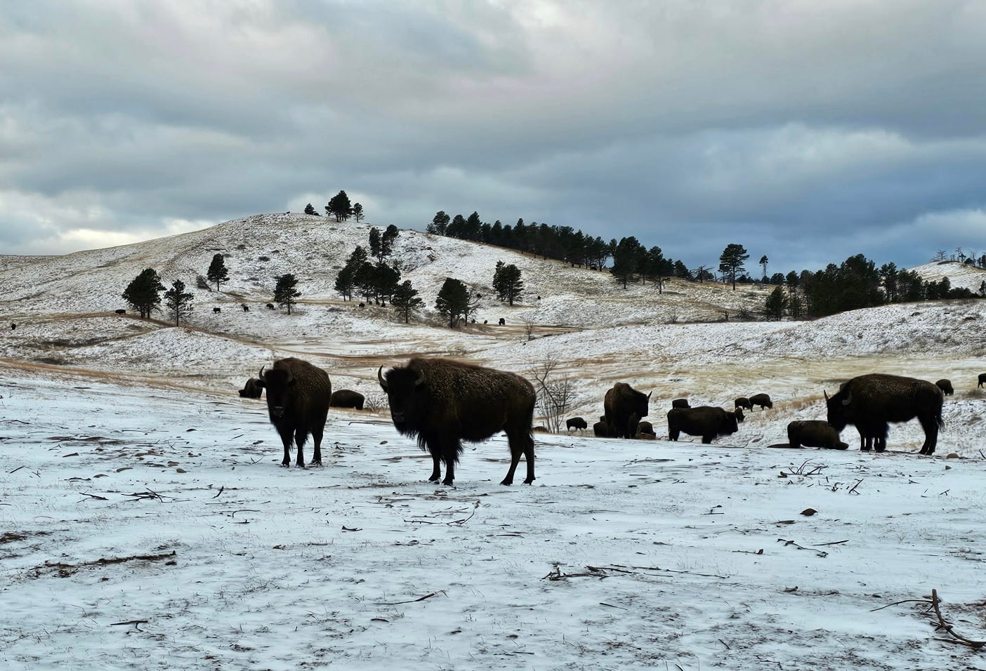 Above Wind Cave, buffalo graze below a steel-gray sky. They’re not in a hurry, even as our SUV creeps towards them on the gravel road.